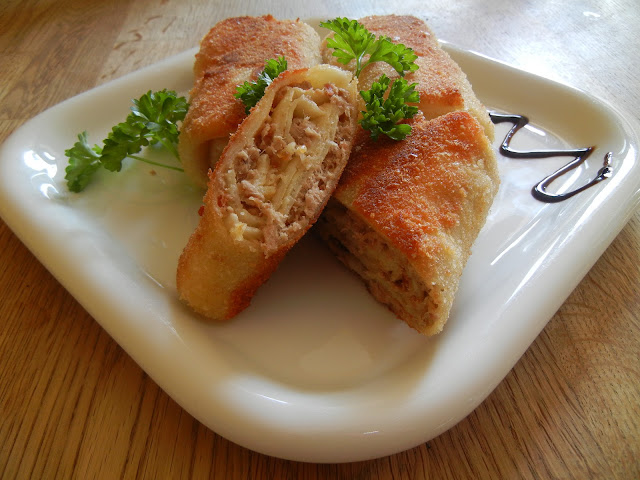 - Na kazdy nalesnik nakladamy farsz i skladamy dwa boki do srodka ,nastepnie zwijamy tak ,aby powstal krokiet.