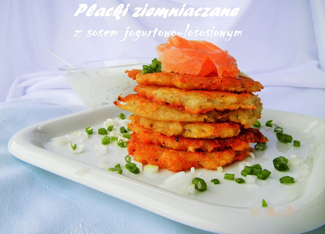 - Z jogurtu ,smietany-na maly kubek jogurtu ,dodaje lyzke smietany ,szczypiorku i pokroionych dwoch plasterkow lososia robimy sos ,ktory doprawiamy do smaku sola ,pieprzem i ewentualnie cukrem. Placuszki podajemy z pozostalymi plastrami lososia i sosem . Smacznego