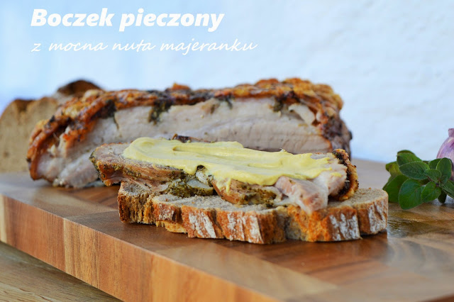 Pyszny ,aromatyczny pieczony boczek. Mozna jesc go na cieplo ,mozna na zimno .Polecam z musztarda ,chrzanem lub cwikla .