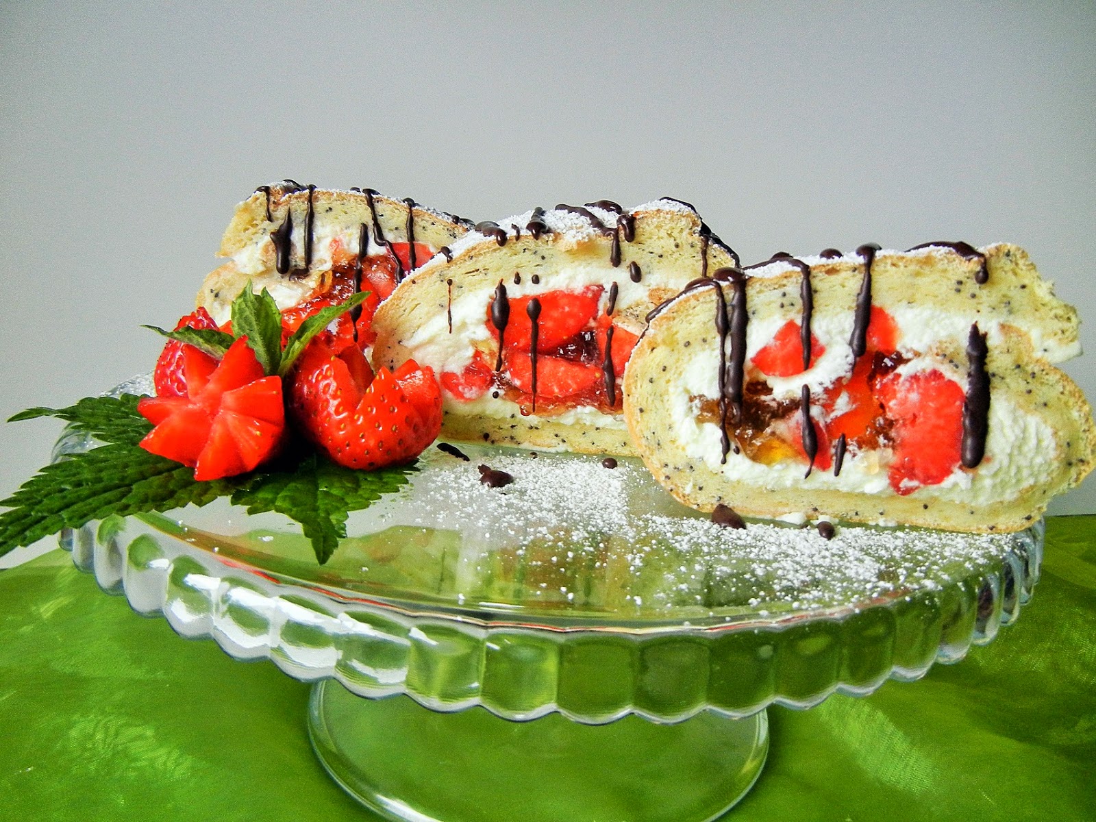Pyszna rolada biszkoptowa z delikatnym dodatkiem maku do ciasta , do tego przepyszna Bita smietana , galaretka i truskawki :) .