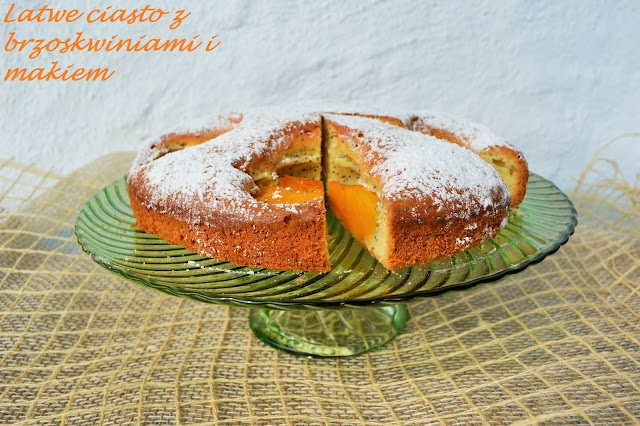 Na ciasto jasne nakladamy w 5 miejsc po lyzce ciasta z makiem a w te miejsca wkladam polowki brzoskwin ,srodkiem do gory.